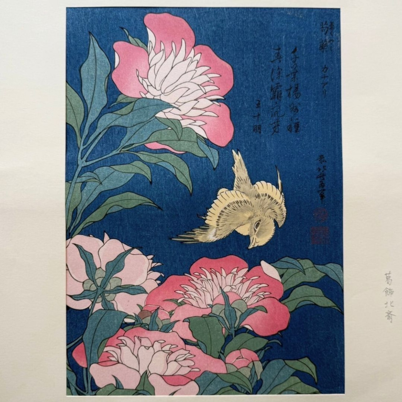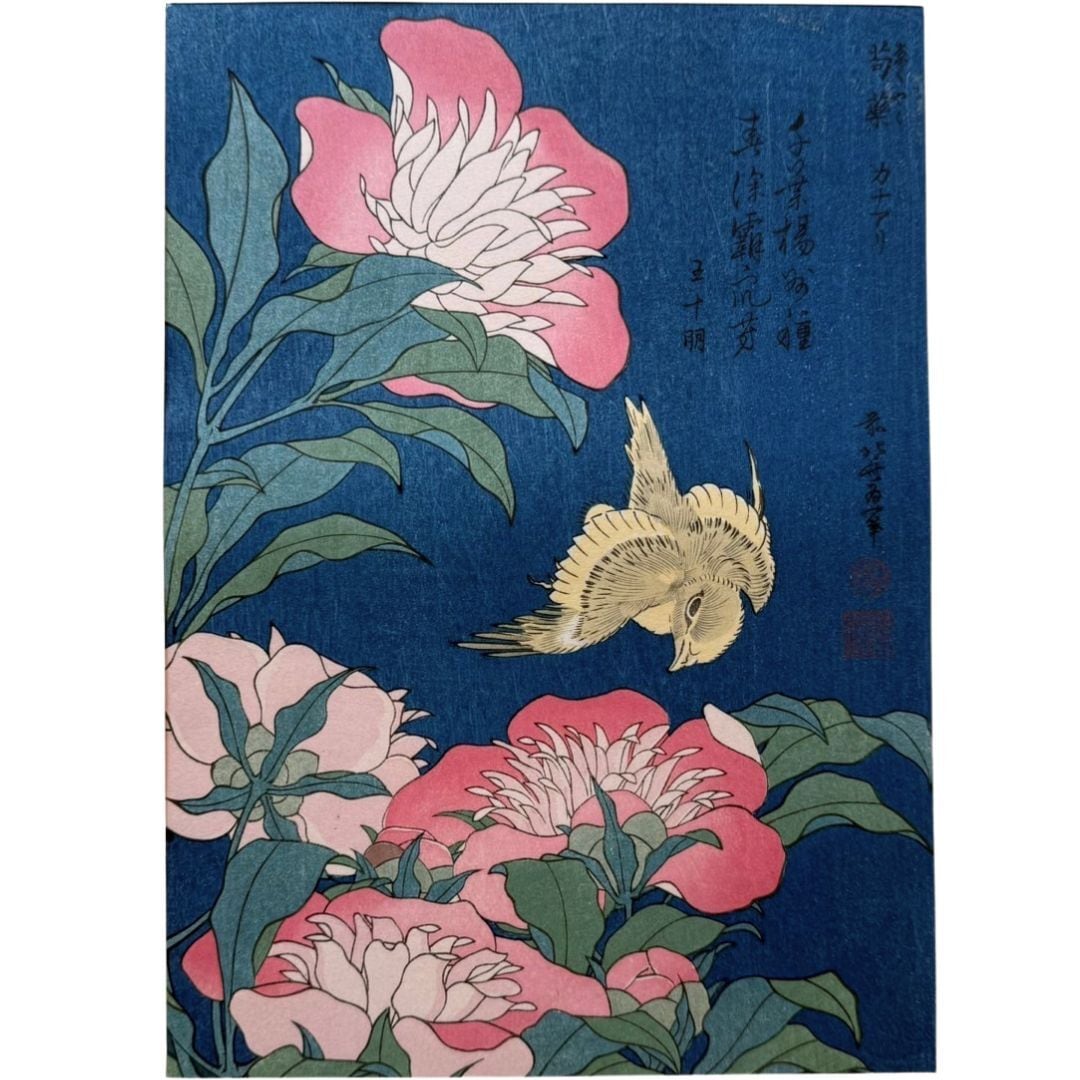 繊細な木版画に描かれた牡丹の豊かな花姿と、カナリアの生き生きとした存在感が、静寂と躍動の静かな対話を紡ぎ出しています。花の豊かで重なり合う花弁と、鳥の軽やかで優美な姿の対比を強調した構図は、自然の調和の一瞬を捉えています。